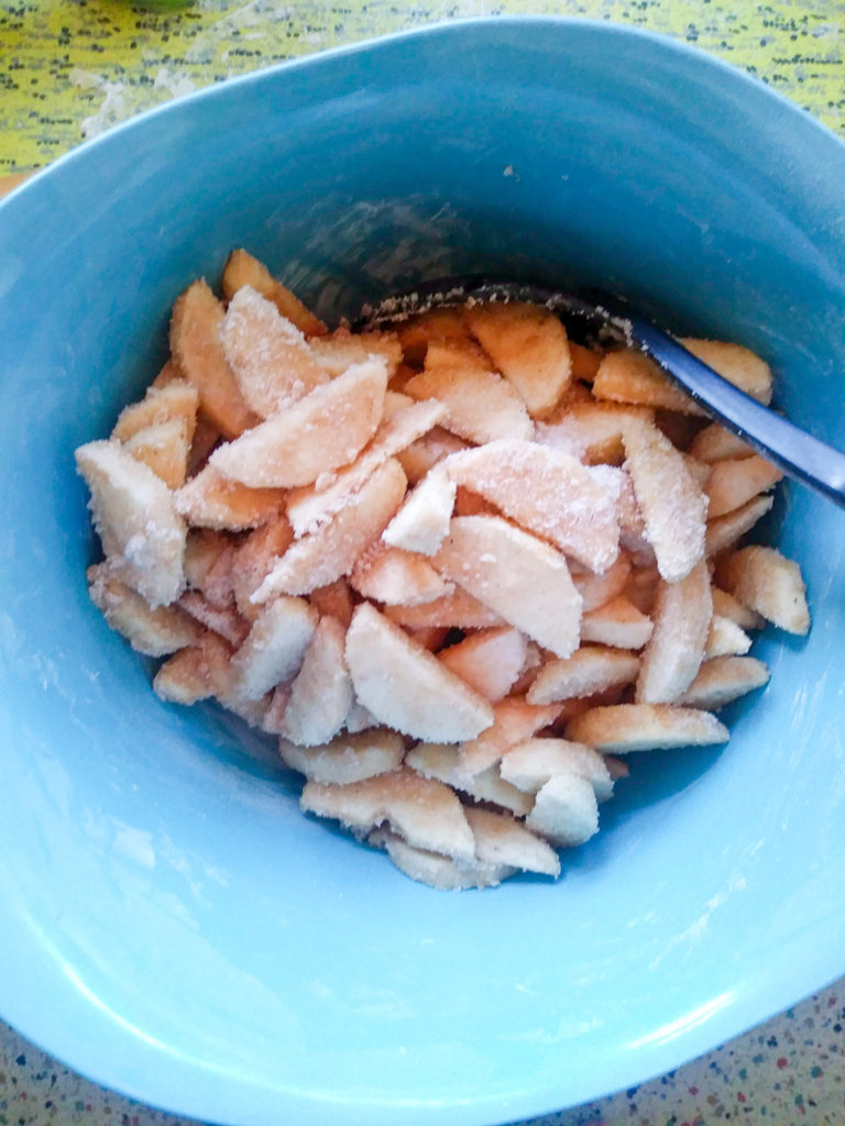 - Slice apples and place in a large bowl. Add sugar mixure and mix until all apples are covered.