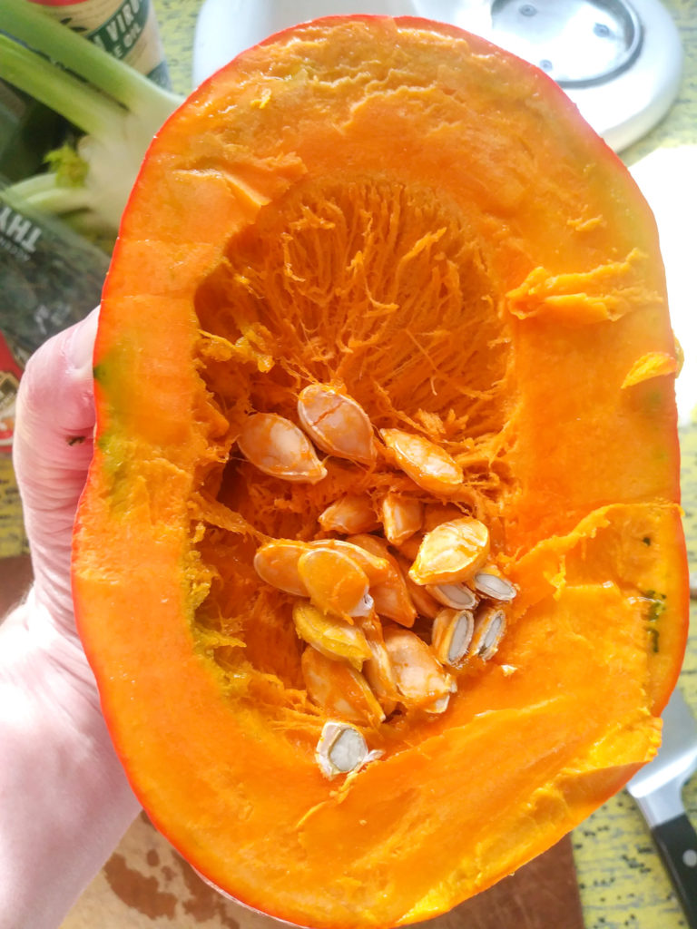 - Cut squash into 4-6 large pieces and scoop out the seeds. Leave the skin on.