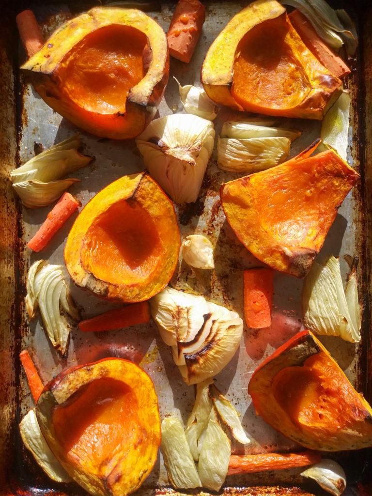 - Put squash, onion, carrots and fennel on to a large cookie sheet along with the garlic cloves (leave the skin on). Drizzle with 2T of olive oil and sprinkle with 1/2 tsp sea salt.